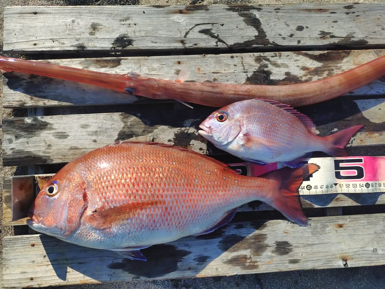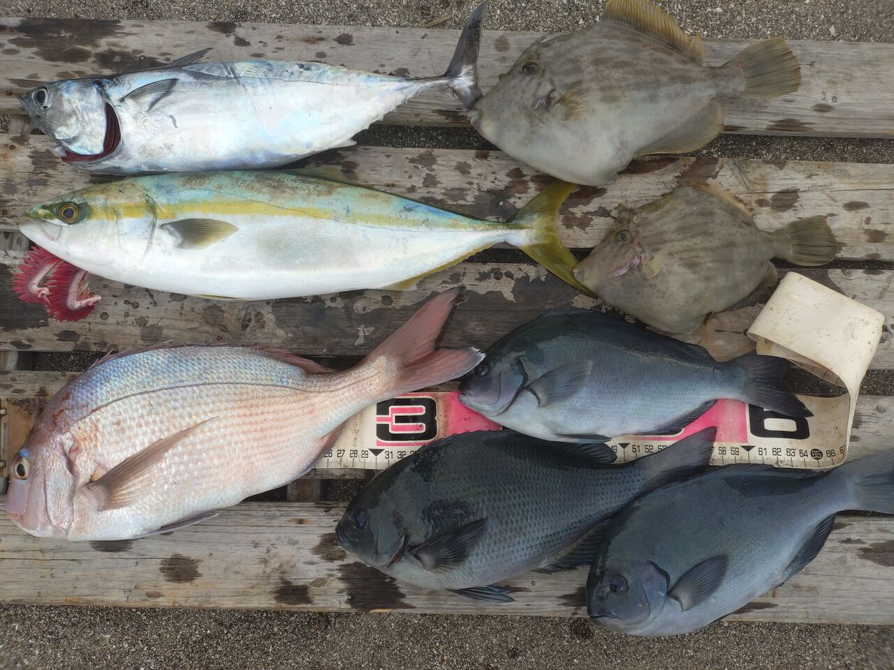 さて、スタッフ山本さんは前半は根周り(中~上級者エリア)で釣りをして、40㎝のマダイの他、メジナ、カワハギ、サンバソウ。