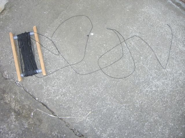 2009年09月19日 私の釣り道具≪リール編≫ 竿が無いのでリールもありません。手釣りです。(写真)私の場合、先端に3弌30僂離ッションが付いてます。これは使う人にもよりますが、付いてない人もいます。次に、確か20号ほどだったと思うのですが(随分前に作ったので正確には覚えていません)、ハリスが付いてます。これも人により長さが違いますが、私の場合は4ヒロ(6m)です。これはあと何mでビシ等の仕掛けが出てくるという目印になります。そしてここからが手釣り用の糸になるのですが、これには1ヒロごとに小さなチチワが作ってあります。これはタナをとるためにも使いますが、最も重要な役割は前回登場した『クッション竿』に掛けるためにあります。『クッション竿』をボートにセットし、その先端のスナップにこのチチワを掛けます。そして魚が喰うと、この『クッション竿』が伸びて知らせてくれます。またクッションですのでほぼ自動で向こう合わせの状態になります。ですからこの『クッション竿』の強度もそうですが、仕掛け側のクッションの強度も非常に重要になります。当店のブイ周りの場合、年間を通じて非常に様々な魚が釣れます。その時期、その状況に応じて、このクッションのパターンを変えることが、釣率アップにつながると私は考えてます。ここでの説明だけでは分かりづらいと思いますので、近いうちに実際に使用してる写真を掲載しようと思います。