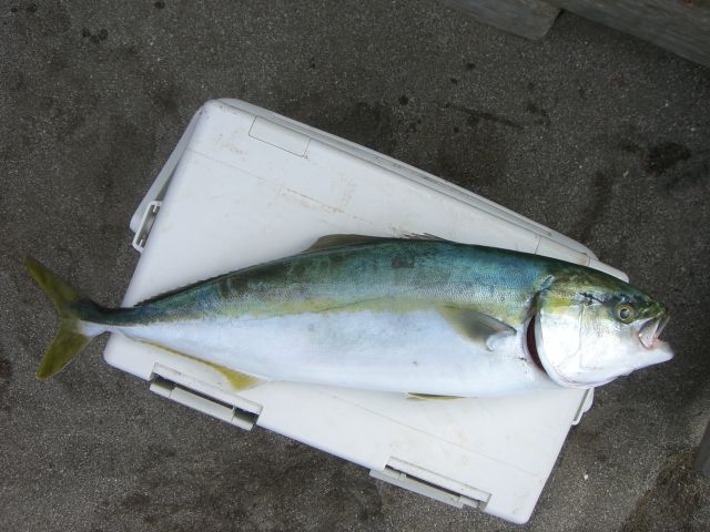 2009年09月23日 反則ですが 私の弟が釣り上げた、(一応)ワラサです。60僂覆里妊リですけど。実はこれを釣り上げたポイントは、当店のエリア外。マイボートのみが行けるポイントになります。ただ、エリア外と言ってもブイからは目と鼻の先。ブイで釣れることも十分に考えられます。しかしワラサ狙いとなるとハリスもそれなりに太いものにしなければなりません。そうなると浅場のマダイ釣りにはかなり厳しい。難しいところです。