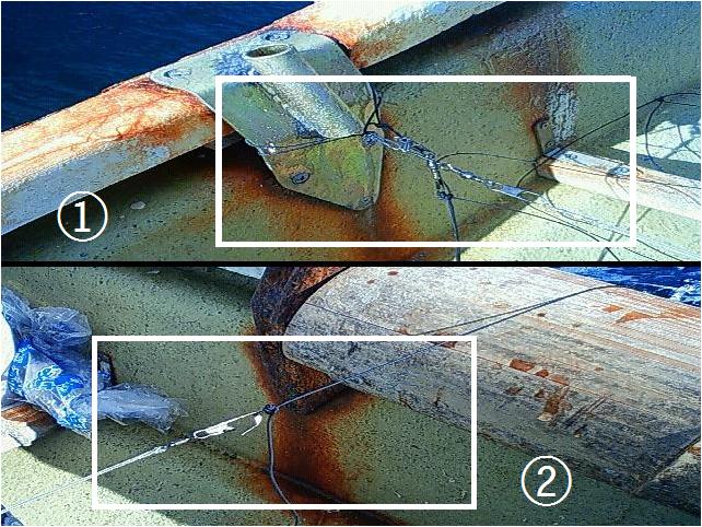 2009年09月29日 私の釣り道具 以前ご紹介した『クッション竿』と手釣り糸の使用写真になります。まずクッションのスナップが無い方をボートのクラッチ台、もしくはクラッチにセットします。私の場合、クッションにダブルスナップを付け、古くなった手釣り糸をクラッチ台に結び、そこに接続してあります。(写真 写真△魯ッションのスナップ側に手釣り糸にのチチワを掛けたところです。これが『待ち』の状態になります。釣り竿ならば、竿掛けに竿を置いた状態と同じです。手釣りのデメリットは、常に糸を持ち続けていなければならないことが一つにありますが、この方法ならばそれは解消されます。あとは魚が喰いつけばこの『クッション竿』が伸び、それなりに合わせの役割もしてくれます。これも基本的には竿と一緒です。そしてこの釣りの最大のメリットは、なんと言っても手返しの早さ。竿ですとどうしても、竿を立て、ハリスを掴み、竿を置き、ハリスを手繰り寄せ魚を引き上げる、という流れになります。しかし手釣りの場合、手釣り糸を巻き上げていけばそのまま直接ビシ、ハリス、魚と、一連の作業が同じ動作で行えます。さらにもう一つメリットをあげるとすれば、それは『ドラグの自由度と俊敏性の高さ』といったところでしょうか。なんせ魚が掛かった時点からは、自分の腕が竿とリール、指がドラグになるのですから。非常に柔らかい竿を使用した場合、魚がばれにくくなるというメリットがありますが、そこそこのサイズの魚が掛かった場合にはやはり釣り上げるのに少々時間がかかります。しかし手釣りの場合は『クッション竿』を柔らかめの設定にしても、いざ魚をあげる時は自分の腕を使うので、常にその魚に合わせたやり取りが瞬時に可能です。今回は長くなりましたが、以上のような理由で私は手釣りをしているわけであります。