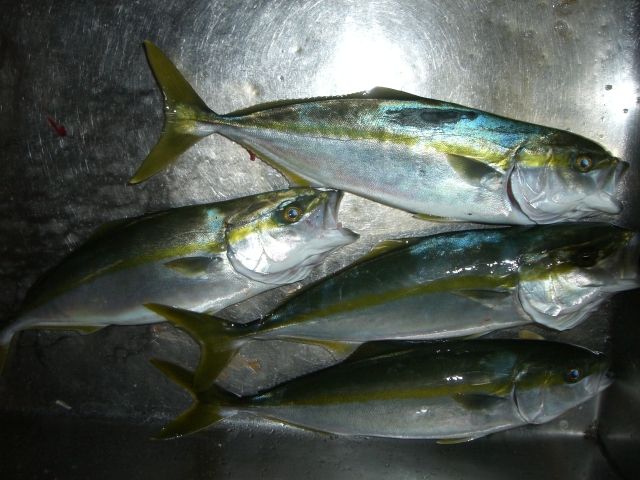 2009年09月28日 狙いはカンパチ 正直なところ、ちょっとイナダには飽きまして・・・。そこでカッタクリでのカンパチ狙いをしてみました。で、まあ、予想はしていましたが、結局イナダだらけになっちゃいました。しかもサイズもよろしくない。そんなわけでカッタクリも嫌になり、いつも通りのマダイ仕掛けに変更。でもそれでもイナダだらけ。金曜日と今日、合わせて6時間程の釣りで、およそ50本以上。イナダに愛された男。